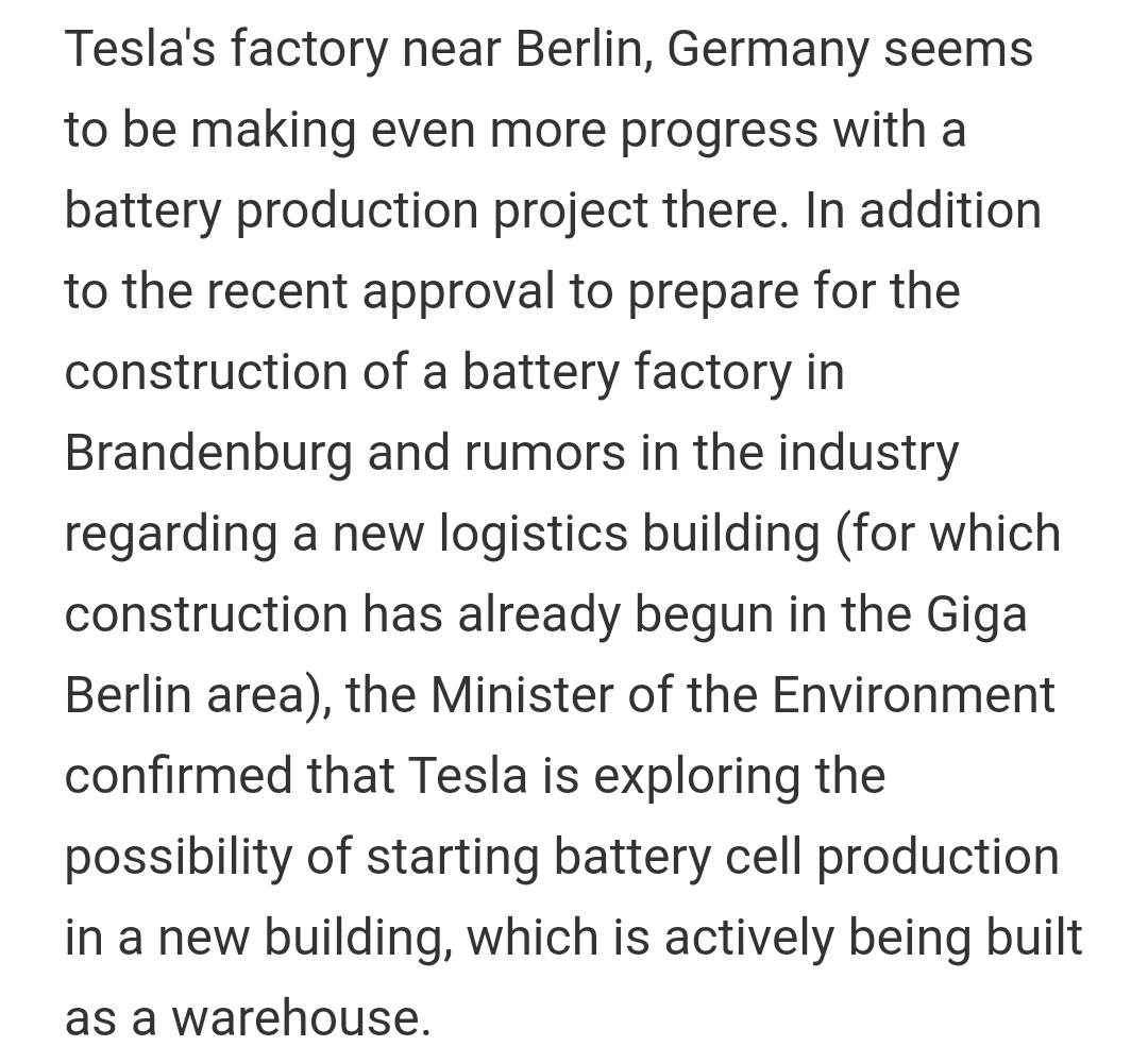 1. 기가 베를린의 완공이 다가오면서 환경청의 허가 여부에 대해 귀추가 주목되고 있는 가운데, 환경부 장관은 활발히 건설 중인 창고가 배타리 공장으로 용도 전환을 할 수 있는지에 대한 가능성을 모색하고 있다고 합니다.