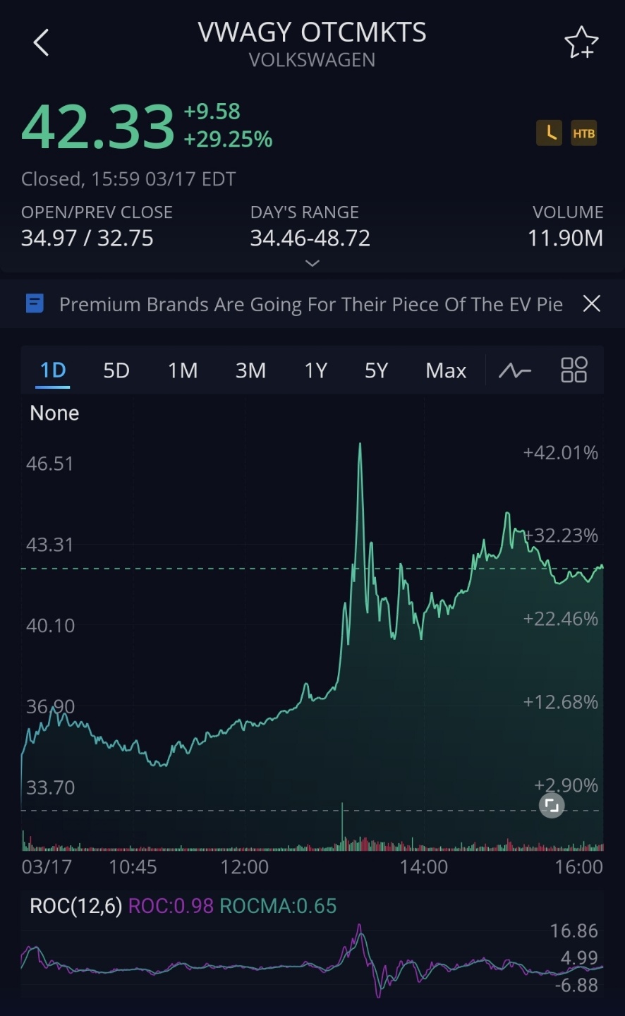 4. 폴크스바겐 주가(VWAGY)가 어제도 약 29% 정도 올랐습니다.