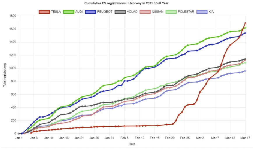 2. 노르웨이에서의 등록량이 나왔는데 올해 1월 1일부터 테슬라는 1,689대가 등록되었습니다.