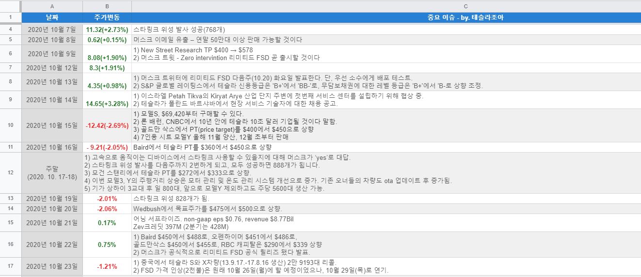 시간순 날짜,주가변동,중요 이슈 - by. 테슬라조아 2020년 10월 5일,2.55% 2020년 10월 6일,‒11.70(-2.75%),전세계 니켈 자원 중 25%를 가지고 있는 인도네시아와 투자 논의 2020년 10월 7일,11.32(+2.73%),스타링