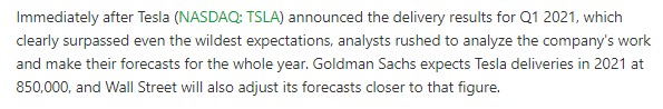 4. 골드만 삭스에서는 2021년 테슬라 딜리버리가 85만대로 예상되며, 월 스트리트에서도 이 수치에 근접해 전망치를 조정할 것이라고 합니다.