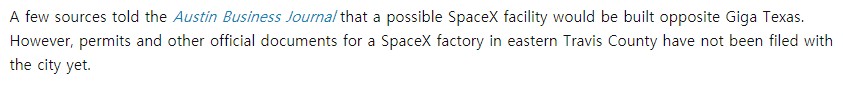 5. 기가 텍사스 맞은 편에 스페이스X 시설이 들어설 수 있다는 루머가 있습니다. 소스는 오스틴 비즈니스 저널입니다.