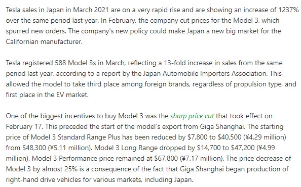 1. 2021년 3월 일본에서의 테슬라 모델3 판매량은 588대로, 작년대비 1237% 가 상승했습니다.