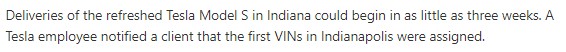 2. 리프레쉬 모델S가 인디애나에는 3주 안에 딜리버리 될 예정이라고 합니다.