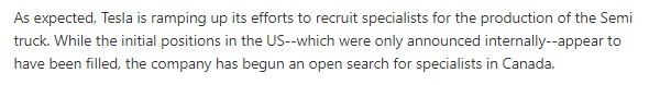 6. 세미 트럭도 생산을 위한 전문가 영입을 위해 노력 중입니다. 캐나다에서 전문 인력 공개 채용이 시작되었다네요.
