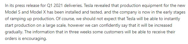 모델S와 X의 시험 생산이 끝났기 때문에, 점차 생산량과 판매량이 증가할 것으로 보입니다.