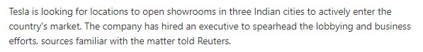 4. 테슬라가 인도 3개 도시에 쇼룸을 열어 적극적으로 시장 진출을 위한 장소를 물색 중이며, 로비 담당 임원을 고용했습니다.