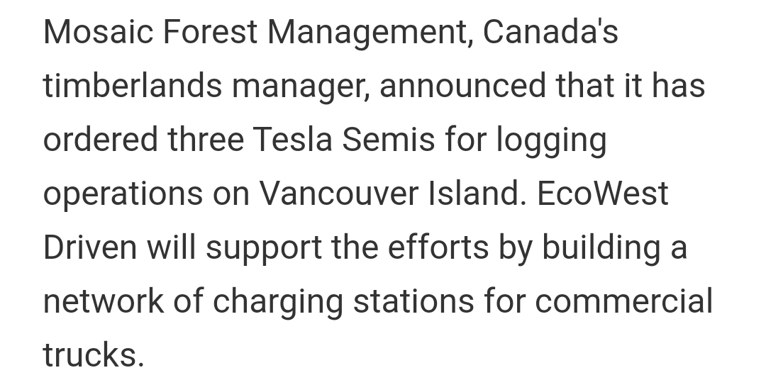 3. Mosaic Forest Management 는 캐나다 벤쿠버 섬의 벌목 때의 사용을 위해 세미 트럭 3대를 주문했습니다.