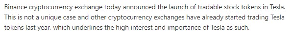'Binance cryptocurrency exchange(바이낸스 암호화폐 거래소)'에서의 테슬라 트레이딩 가능한 주식 토근 출시였습니다.