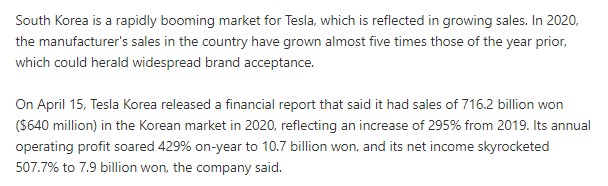 2. 4월 15일, 테슬라 코리아 발표에 의하면 2020년보다 295% 증가한 7162억 매출을 기록했습니다.