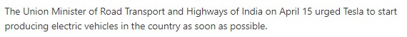1. 인도 도로교통부 장관이 테슬라의 가능한 빠른 국내 생산을 위한 착수를 촉구했습니다.