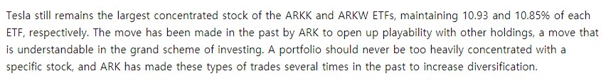 그러나 여전히, ARKK는 10.93%, ARKW ETF는 10.85%, 테슬라가 비중을 차지하고 있습니다.