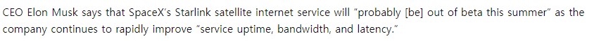 7. 머스크에 의하면 올여름부터는 스타링크 위성 서비스가 베타에서 벗어날 것이라고 합니다.