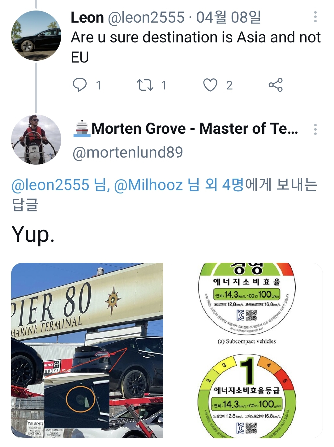 2. 모델Y 가 드디어 한국으로 딜리버리를 위해 선박에 실렸네요.