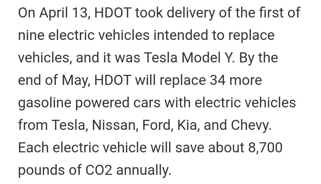 1. 하와이 교통부(HDOT)는 34개의 가솔린 차량 중 일부를 테슬라 모댈Y로 교체할 예정입니다.