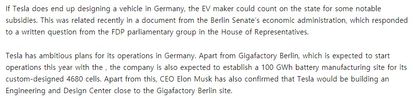 6. 테슬라가 독일에서 자동차 디자인을 하게 되면, 국가에서 보조금을 받을 수 있을 거란 전망입니다.