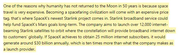 1. 스페이스X에서 2,500만 인터넷 가입자를 확보하게 되면, 연간 300억 달러(약 1조 2천억원) 정도의 수익을 올릴 수 있습니다.