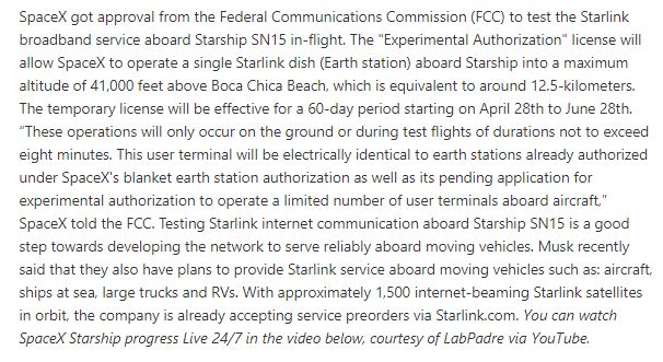 2. 스페이스X에서 스타쉽 SN15에 스타링크 단말기를 장착하여 테스트할 수 있도록 FCC를 통해 승인을 받았습니다.