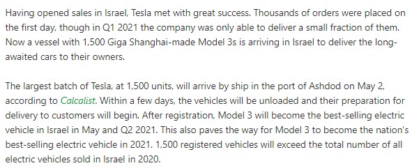 1. 이스라엘의 애쉬도드 항에 1,500대의 모델3를 실은 선박이 5월 2일 도착 예정이라고 합니다.