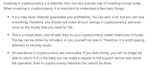 1) 암호화폐는 고위험성 자산이고, 아무도 우리의 수익성을 보장하지 않습니다.