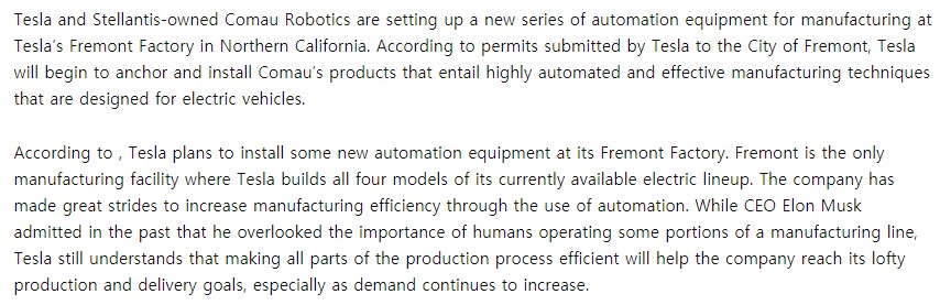 4. Comau Robotics(테슬라와 스텔란티스의 소유)는 프리몬트 공장에 제조를 위한 새로운 자동화 장비를 설치하고 있습니다.