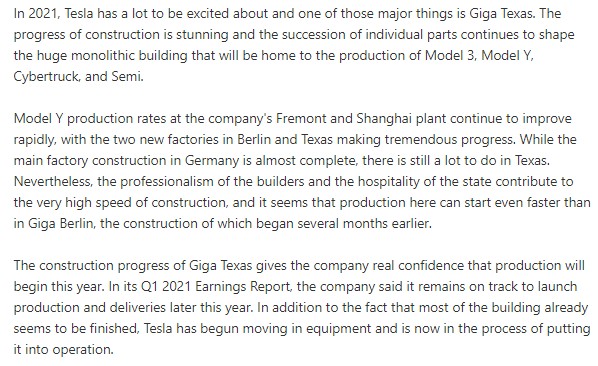 2. 테슬라에서는 올해 기가 텍사스에서 생산과 납품 개시를 할 수 있을 거라는 강한 자신감을 내비치고 있습니다.