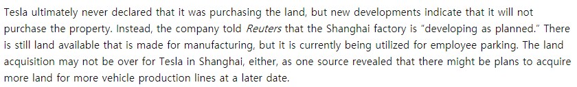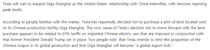 3. 로이터 통신에 따르면, 테슬라가 기가 상하이 근처의 토지 매입을 하지 않기로 결정했다고 합니다.