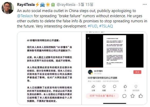 6. 증거 없이 테슬라 브레이크 내용을 보도한 언론들이 공개 사과했습니다.