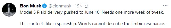 3. 머스크는 모델S 플래드 딜리버리 이벤트를 기존 6월 3일에서 일주일 연기하여 6월 10일에 열거라 트윗했습니다.