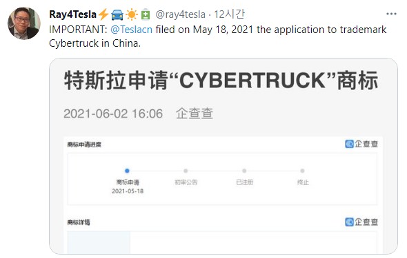 2. 2021년 5월 18일, 중국에 사이버 트럭 상표가 신청됐다고 합니다.