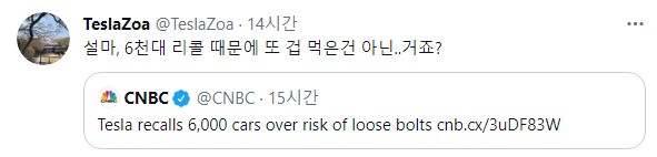 1. CNBC 에서 브레이크 캘리퍼 볼트가 느슨해 질 수 있어 테슬라 차량 5,974대를 리콜한다는 보도가 나왔는데, 그 영향이 큰지 어제 주가는 -3.01% 하락했습니다.