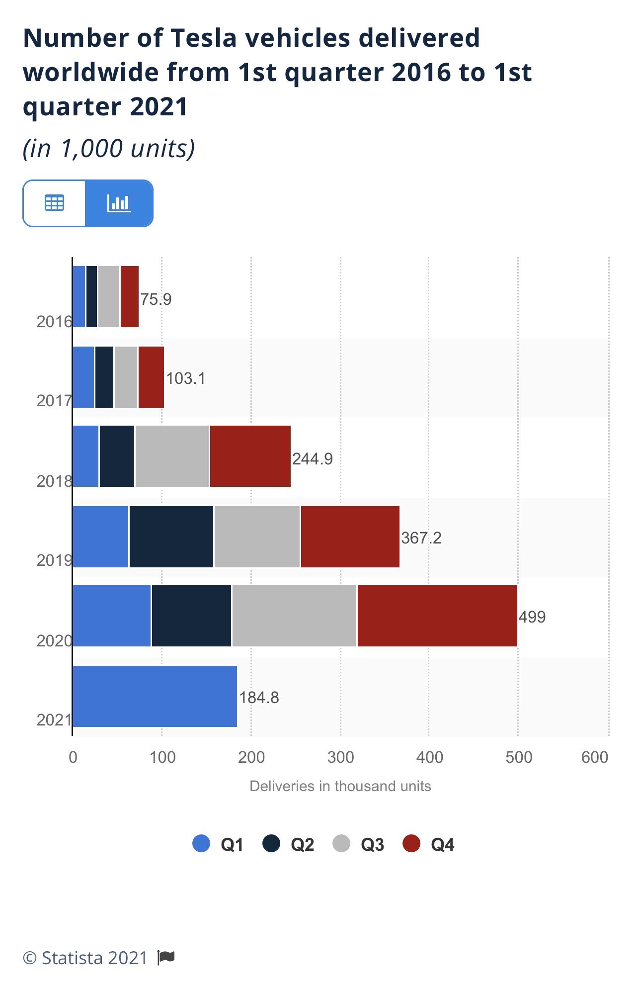 이 자료를 보면, 테슬라의 판매량이 나날이 급증하고 있다는 것을 확인 할 수 있습니다.