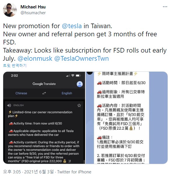 2. 대만의 새로운 프로모션의 내용을 살며 보면, FSD 구독이 7월 초에 가능할 것으로 보여진다고 합니다.