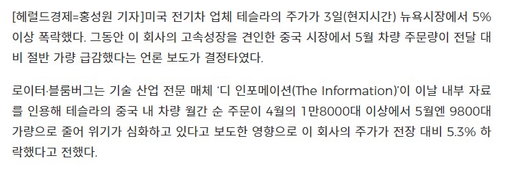 미국 전기차 업체 테슬라의 주가가 3일(현지시간) 뉴욕시장에서 5% 이상 폭락했다. 그동안 이 회사의 고속성장을 견인한 중국 시장에서 5월 차량 주문량이 전달 대비 절반 가량 급감했다는 언론