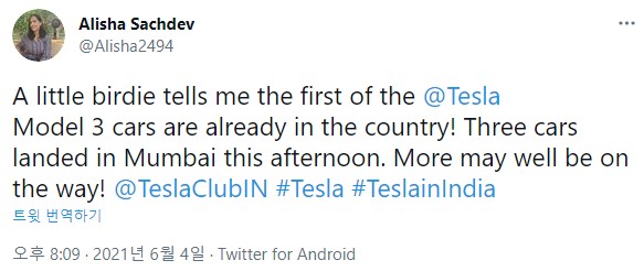 4. 인도(India) 에 테스트를 위한 모델3 3대는 이미 도착해 있다고 합니다.