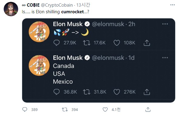 3. 다들 아시겠지만, 머스크의 Canada, USA, Mexico 트윗 이후, CumRocket 이라는 코인이 약 350% 상승했습니다.