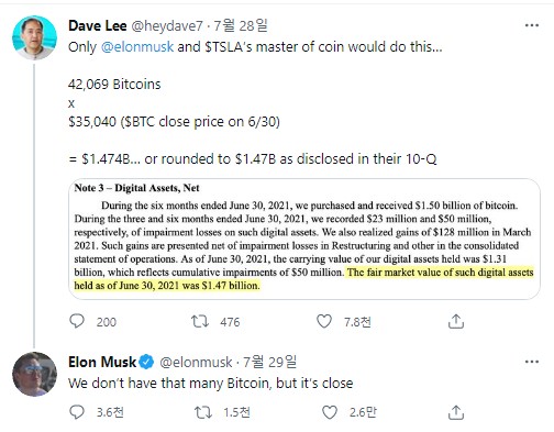 1. 10-Q에 명시된 테슬라의 비트코인 보유 금액 $1.47B를 비트코인 시세 $35,040 로 나눠 보니, 42,069개가 된다고 합니다.