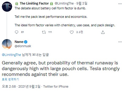 3. 이전의 머스크 트윗인데, 머스크의 생각을 들여다 보면, 테슬라는 앞으로도 파우치 셀을 사용하지 않을 것으로 보입니다.