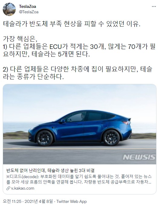 이 말은 즉, 테슬라에게는 반도체 쇼티지로 인한 문제가 없을 것이라는 말과 같습니다.