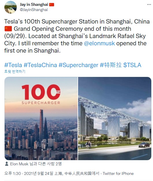 2. 중국 상하이에 100번째 슈퍼차저 스테이션을 설치했고, 스톨 수는 1천개 이상입니다.