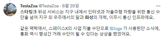 개인적으로는 머스크가 스타링크도, 도지코인도 단순히 지구에서만의 사용을 위해 만들고, 펌핑시킨다고 생각하지 않았는데, 이러한 상상들은 조금씩 현실로 다가오는 느낌입니다.
