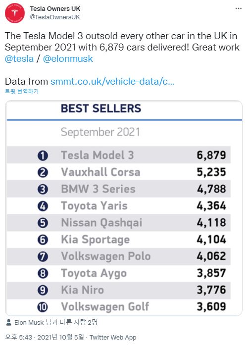 2. 테슬라 모델3는 올해 9월, 영국에서 6,879대가 팔렸습니다.