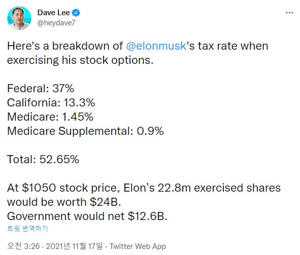 2번째 방법은 22.8M주 옵션을 행사하고 얻은 주식의 3/4을 매도하는 것인데, 이 경우의 세율이 52.65% 인 것이죠.
