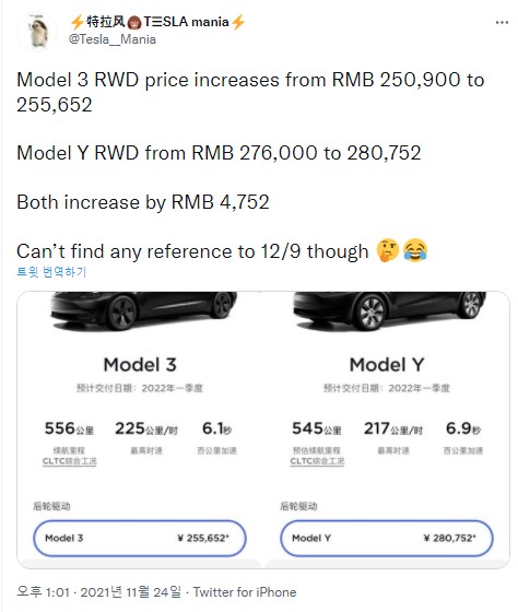 2. 테슬라 차이나에서도 모델3/Y RWD 의 가격을 약 3-4천 위안 정도 인상했습니다.