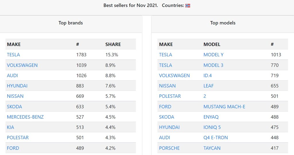 1. 테슬라 모델3/Y가 노르웨이 EV 시장을 이끌고 있습니다.