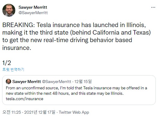 1. 테슬라에서 캘리포니아와 텍사스에 이어 일리노이 주에서 보험상품을 출시했습니다.
