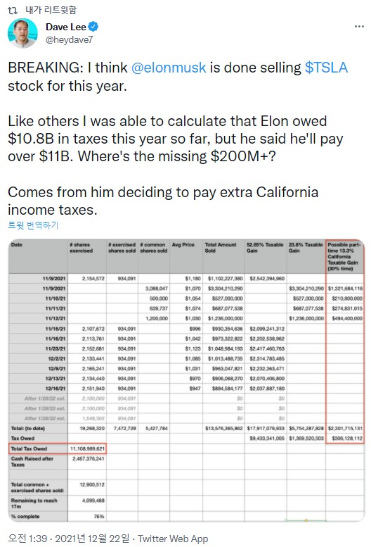 이는 개리 블랙과 동일한 개인적 주장인데, 캘리포니아에서의 소득세 추가 납부를 포함하면, 일론머스크가 말한 올해의 $ 11B 와 거의 딱 들어맞기 때문입니다.