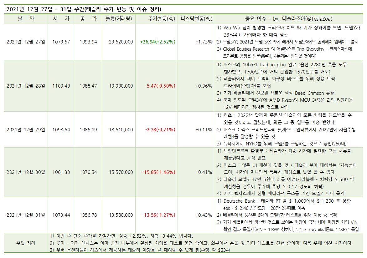 | 2021년 12월 27일 | +2.52% | 1) Wu Wa 님이 촬영한 크리스마 이브 때 기가 상하이를 보면, 모델Y가 38~44초 사이마다 한 대씩 생산 2) 모델3/Y, 2021년 모델 S/X 외에 레거시 모델S/X에도 홀리데이 업데이트 출시 3) Global Equities Research 의 애널리스트 Trip Chowdhry : 크리스마스에 프리몬트 공장을 방문했는데, 4분기는 '방대할 것이다' |