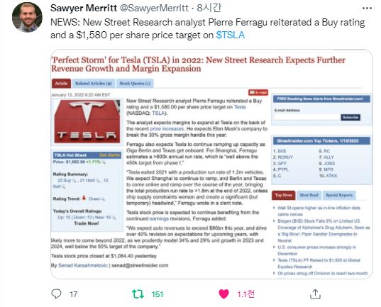 2. New Street Research 에서 테슬라 PT, $ 1,580와 'Buy' 등급을 유지했습니다.