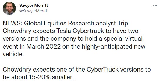 4. Global Equities Research 의 애널리스트 Trip Chowdhry 에 의하면 2022년 3월에 스페셜한 가상 이벤트가 있는데 이 때, 사이버 트럭의 2가지 버전이 공개될 예정이라고 합니다.